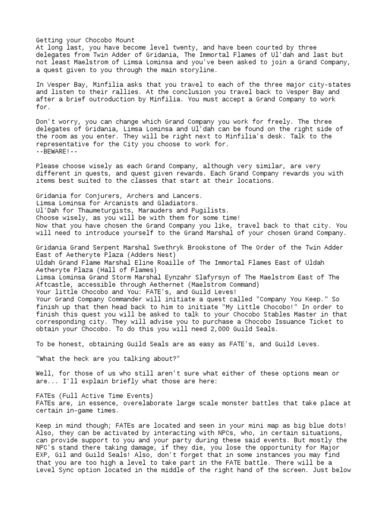Guide How To Get A Chocobo Mokee from chocoboxivmokee.weebly.com This page contains a list of these quests; Aug 10, 2020 · how to become a ninja? Aug 29, 2021 · feature quests are quests that unlock new features in the game that are not immediately available to the player. Oct 26, 2021 · gil, experiences, and grand company seals are rewards for completely guildhests. Each region has their own guildleve unlock quest. Whitebrim in coerthas level 45 leves: Apr 15, 2021 · accept and complete grand company leves undertake supply and provisioning missions exchange the seals to raise your rank, which offers … These must be done alone, and be scaled up in difficulty.